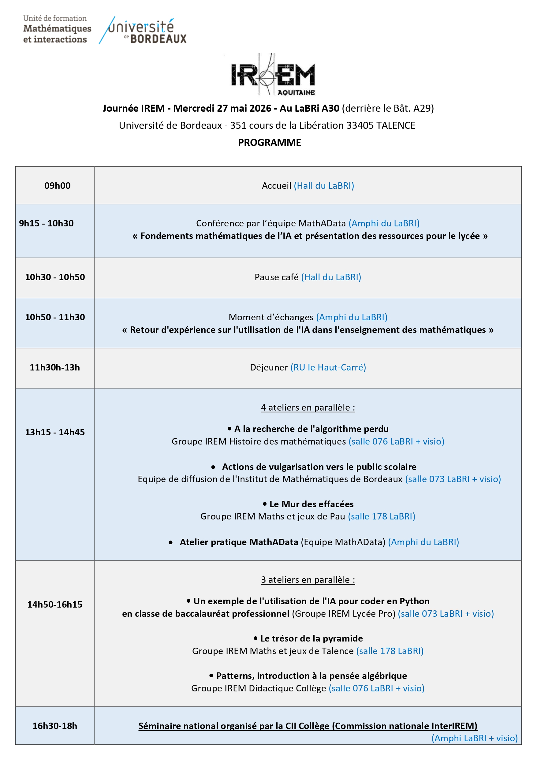 Journée de l'IREM mercredi 27 mai 2026